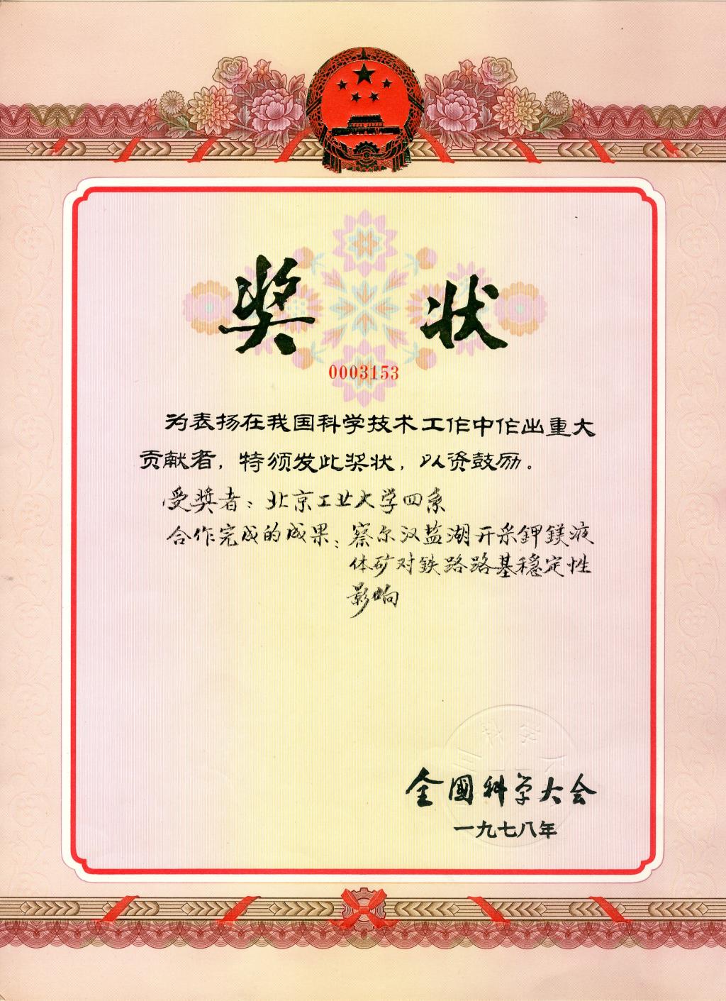 1978年全国科学大会上我校有22个科研项目获奖。此展品为获奖证书之一