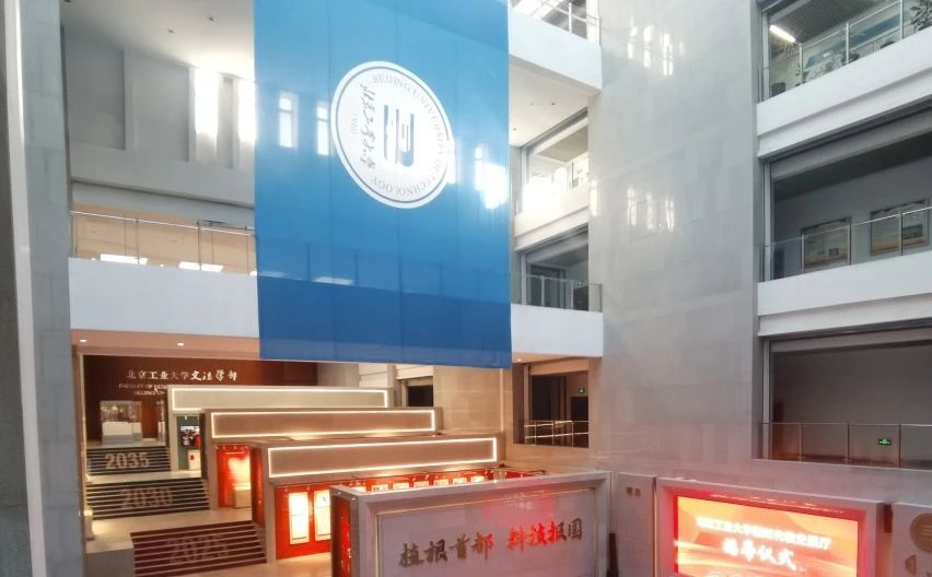 进入一层大厅,墙上展示着校徽、校歌、校训及初心使命,代表着北工大人坚持以服务国家、服务首都为最高追求,实干担当、守正创新,秉承“不息为体,日新为道”的校训精神,传承“植根首都、科技报国”的初心使命,奋力谱写新时代高质量发展的北工大篇章。