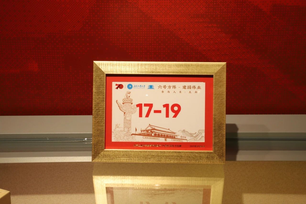 学校为每一位参与庆祝活动的师生都定制了专属点位牌。这块“17-19”的点位牌,在中华人民共和国成立70周年庆祝活动北京市筹备和服务保障工作总结表彰大会上被称赞是“值得北工大师生珍藏一生的荣誉号”。