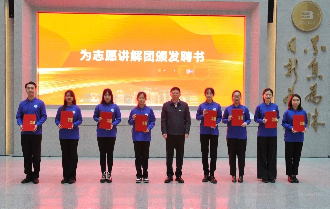 仪式上,姜泽廷为志愿讲解团颁发聘书,聂祚仁接收师生校友代表捐赠物品。