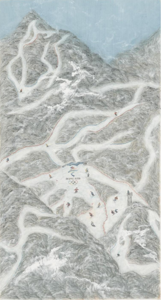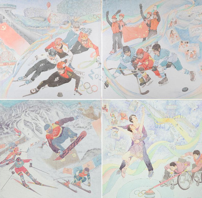 古今融通,交相辉映,传统文化的时代创新仍需在不断创作实践中摸索。冬奥题材的艺术创作,绝不仅仅是将冰雪自然景观与冰雪运动形象简单地组合或叠加,而是需要在深入理解奥林匹克精神的基础上,实现力与美“一加一大于二”的融合,是视觉上的绽放,也是精神上的升华。实验研究中丰富绘画语言与形式表现手段;对推动学科建设,培养优秀创作人才具有重要价值。同时广泛传播和普及中国连续举办夏季奥运会与冬季奥运会的内在深刻含义,推动艺术表现与体育运动的双驱动发展。用鲜活的形象带动全世界了解中国奥林匹克精神,使传统文化得以传承的同时能够与时俱进地完美承载了北京冬奥会的愿景和中国的文化底蕴。