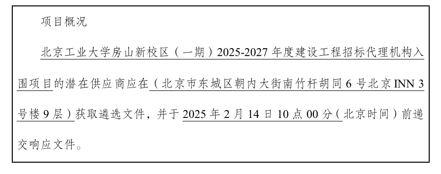 采购需求:best365官网中文版登录房山新校区(一期)2025-2027年建设工程采购代理机构入围,拟选择五家代理单位参与学校房山新校区(一期)建设中涉及的基建和基础设施改造配套和(或)工程造价咨询等工程采购代理服务。入围代理单位只表明进入遴选单位的best365官网中文版登录房山新校区(一期)2025-2027年建设工程代理单位入围库,并不与具体项目挂钩,采购代理过程中遴选单位依据具体的项目择优与之签订采购代理合同。